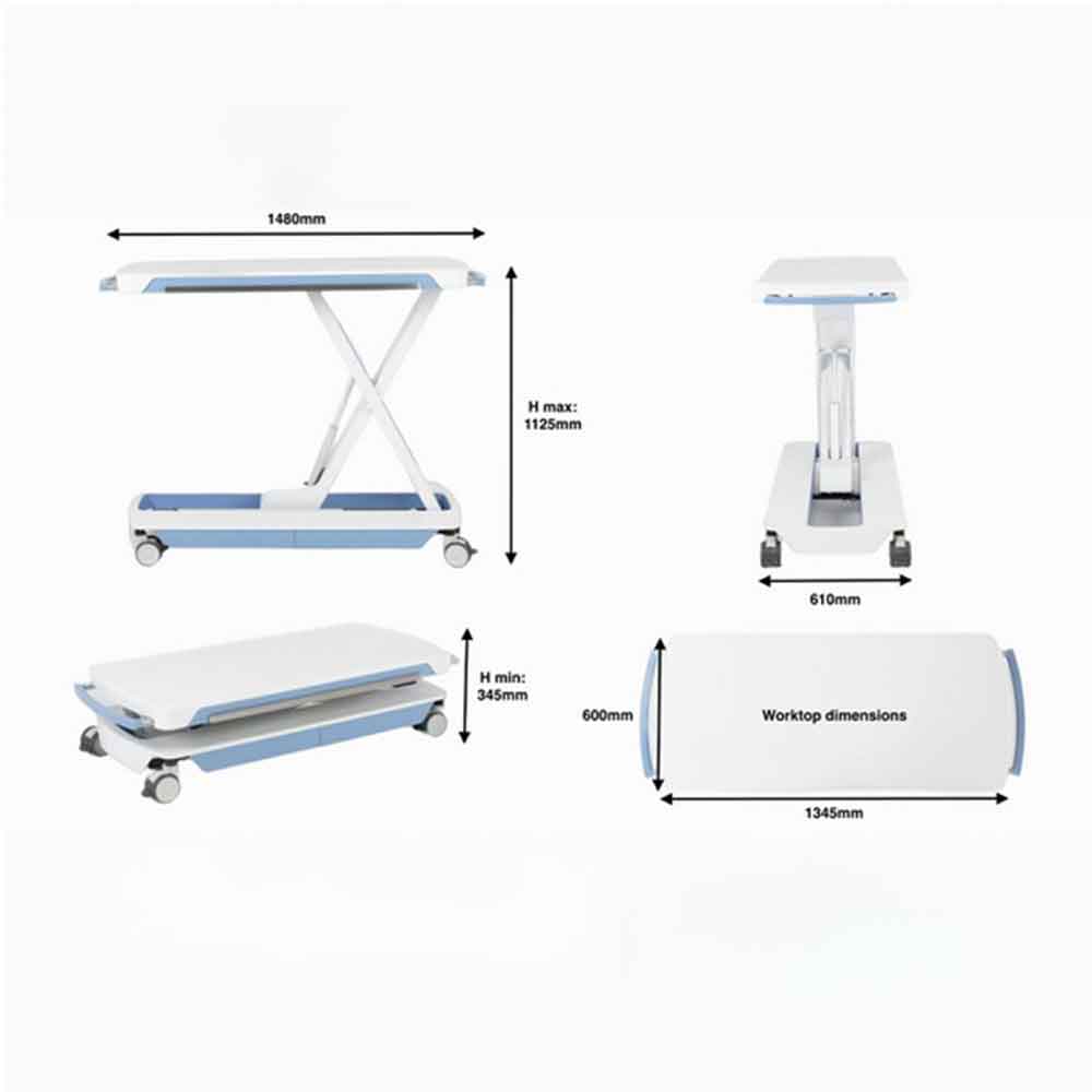 Hand-crafted acrylic surface is smoothly shaped with no sharp edges or hard corners. The motorized scissor lift runs on a powerful integrated battery allowing free movement all day long from a single charge. The large batter capacity and the heavy-duty hospital-grade castors along with convenient and comfortable handles, give amazing mobility and flexibility to the table.
