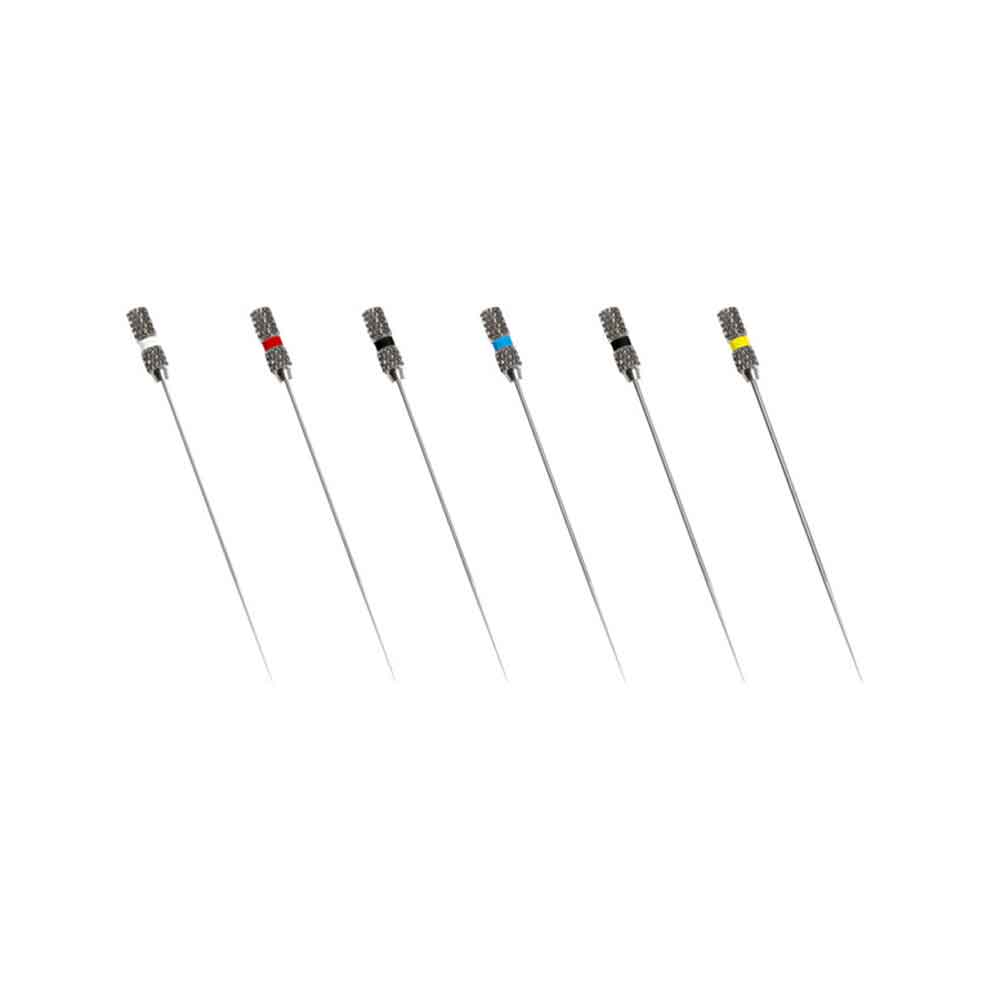 Veterinary length Barbed Broaches, used to remove root canal contents. 60mm overall length, 9mm working length. Pack of 6 pieces in colour coded sizes 1 - 6.